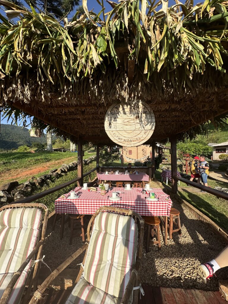 • Dia especial com visita ao bairro do Biguá, conhecido por sua capela histórica onde o Padre Léu celebrou sua primeira missa e pela acolhida da comunidade local, com parada no tradicional bar para provar o famoso torresmo de rolo mineiro. Seguimos para uma imersão na produtora Maria Santa Helena, responsável pelo azeite de oliva Monasto, conhecendo de perto sua história, processos e paixão pela produção artesanal. O dia se encerra no Mirante do Pedrão, com vista espetacular da Serra da Mantiqueira, e em uma experiência gastronômica e cervejeira na Jybá, unindo sabor, tradição e paisagens inesquecíveis.